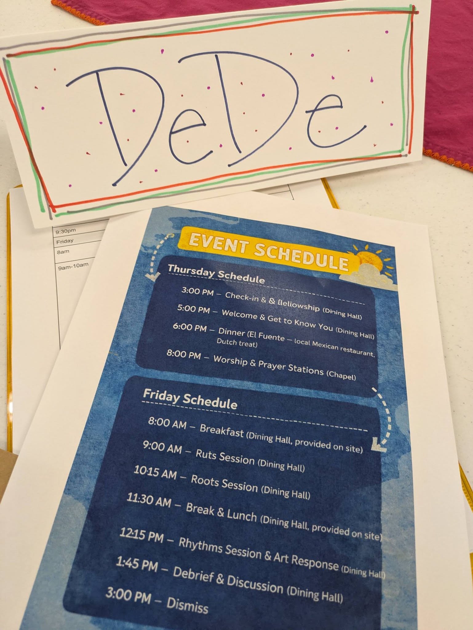 Some attendees stayed in the camp bunkhouse (with excellent climate control and great hot water pressure), while others stayed at a nearby hotel about twenty minutes away. Everyone arrived between 3–5 p.m., gathering in the dining hall with a fun icebreaker: bring a “secret item” that represents something about who you are.