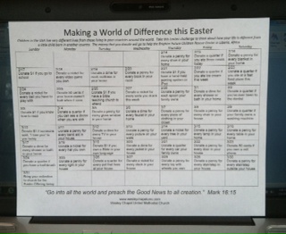 This is the calendar…printed on a word document. We chose a global ministry as the recipient found on the Advance UMC website that relates to children.