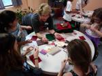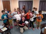 Supplies included: 2 needles per student, scrap fabric for the pillow, batting for stuffing the pillow, 2 small sewing kits with small spools of thread, crayons/chalk for outlining patterns, large 2-hole buttons, dark colored felt (the darker colors make for a stiffer fabric), scissors, paper bags for carrying finished projects or storing unfinished projects, ice water in the large dispenser with small cups for the water-story break.