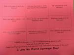 Earlier in the day we set up stations throughout campus with heart stickers (we LOVE our church!) in a clear bucket. Orange caution cones advised us where to go…think: Amazing Race has the red and yellow boxes, we use caution cones found at Dollar Tree. Students are ready with their sticker sheets to place stickers beside vocabulary describing different locations in the church.