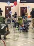 Setup inside the gym included one wall of various target shooting stations, one wall with M&Ms and water stations with camo paper cups, and a corner with 30 chairs for water break and devotion. The rest of the gym was filled with barriers, balloons, random chairs, etc.