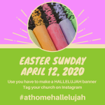 • Hallelujah Project: Use what you have (sidewalk chalk, paper, paint, crayons, string, scraps of wood, etc.) to create a “Hallelujah” banner/sign/message for Easter Sunday. Tag the church on Instagram or Facebook using #athomehallelujah. Another great idea from Christine Hides, Director of Christian Education at Kenilworth Union Church, Kenilworth, Illinois.