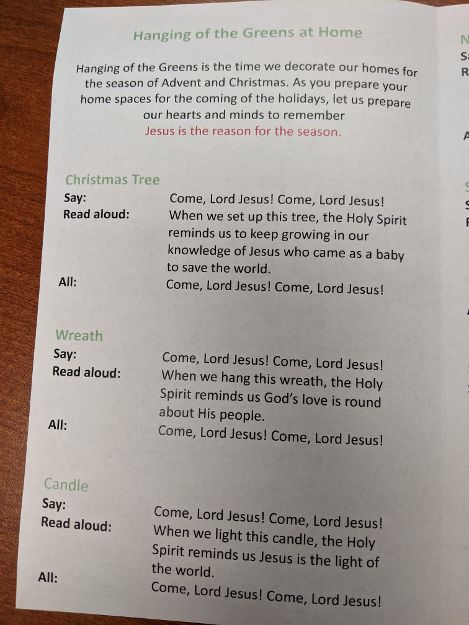 Hanging of the Greens is the time we decorate our homes for the season of Advent and Christmas. As you prepare your home spaces for the coming of the holidays, let us prepare our hearts and minds to remember Jesus is the reason for the season.