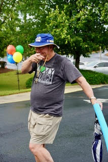 * Car lot vinyl balloons lining the parking lot ‘stage’ (it’s a sidewalk) and “Welcome” feather flags in blue and red lining the main road, all assembled by a small group of retired engineers. Lightweight enough so that the 4th & 5th grade Ambassadors could safely set up.