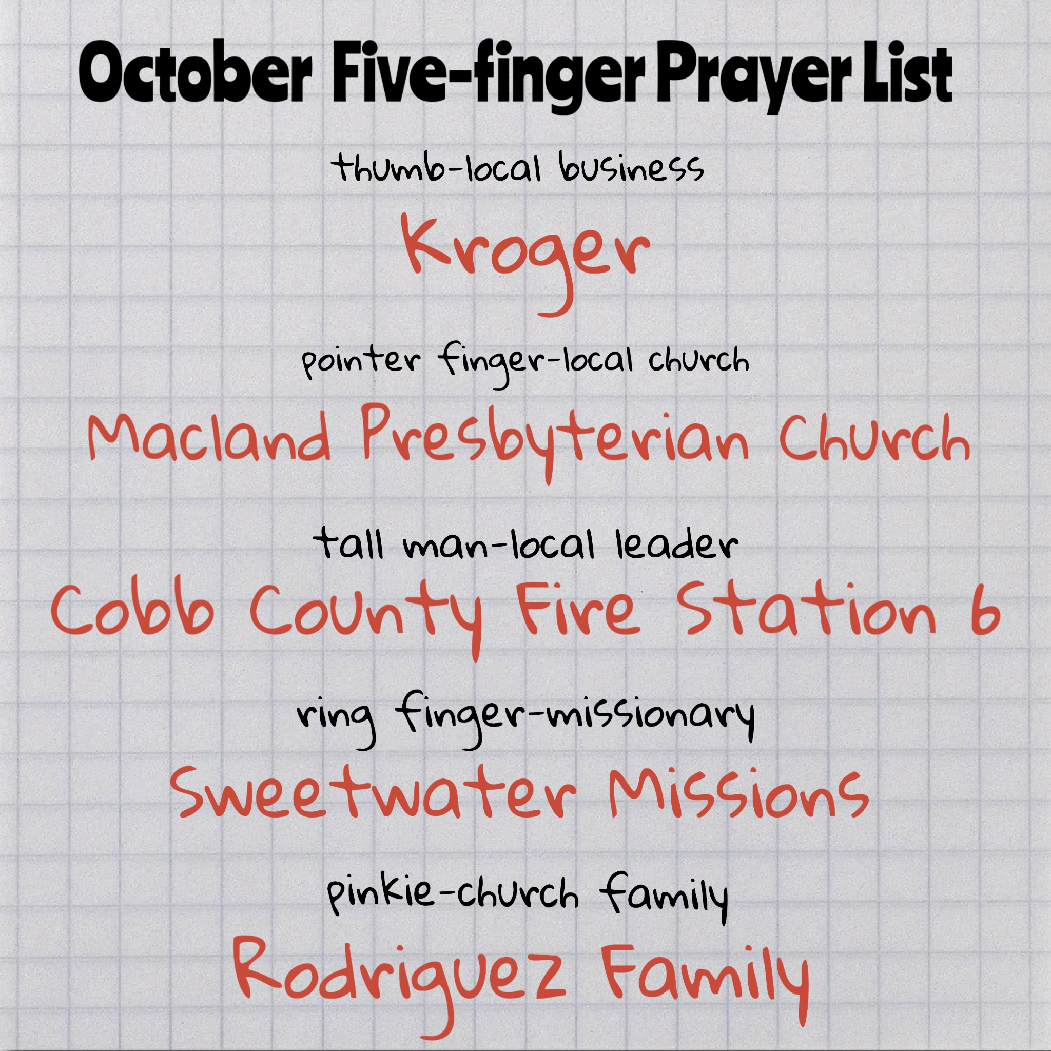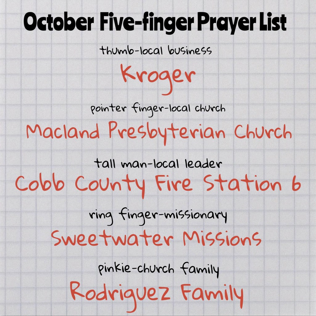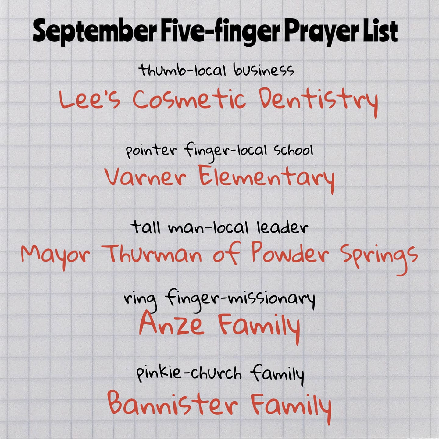 We introduce our monthly five on the first Sunday of each month. A new prayer prompt card is shared with the students to take home. We invite the students to hold up that finger (their whole hand for the tall finger) as we silently pray as a large group for each organization/family/person is named. We practice in large group each week, then follow it up throughout the month on social media and by email who the prayer recipients are each month. This time of silent prayer and repeat-after-me prayers naming our neighbors has become one of my favorite moments each Sunday morning.