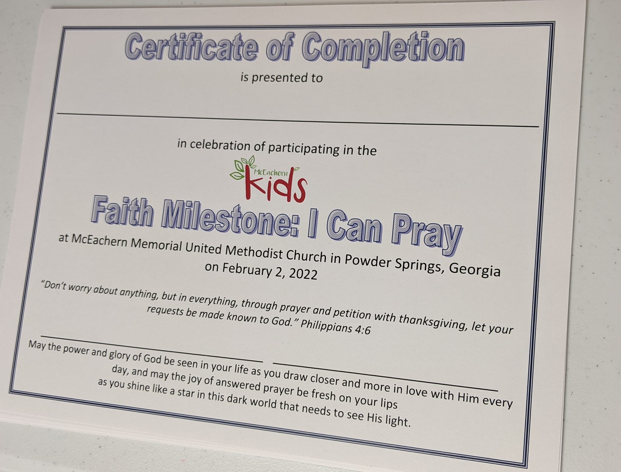 6:15-6:30pm Review 4 steps of prayer (Greet God, Thank God, Ask God, Close in Jesus’ name); invite each child forward to receive their certificate (read one aloud so they know what the certificate says; students receive their certificate AFTER they tell me aloud their favorite station – as they speak aloud I tell them “I LOVE hearing your voice! God wants to hear your voice EVEN MORE!”; close in repeat-after-me prayer and group photo