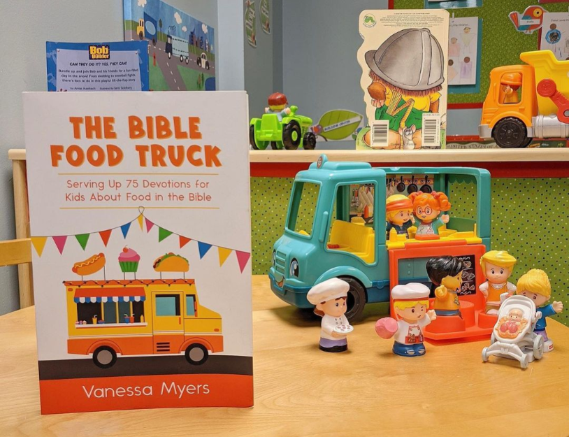 This summer’s month of Thursdays in our parking lot will be a blended model of Fresh Expressions’ Dinner Church and family Vacation Bible School. How did we get here? It all started with learning last fall that Vanessa Myers was publishing a children’s devotional entitled The Bible Food Truck: Serving Up 75 Devotions for Kids About Food in the Bible.