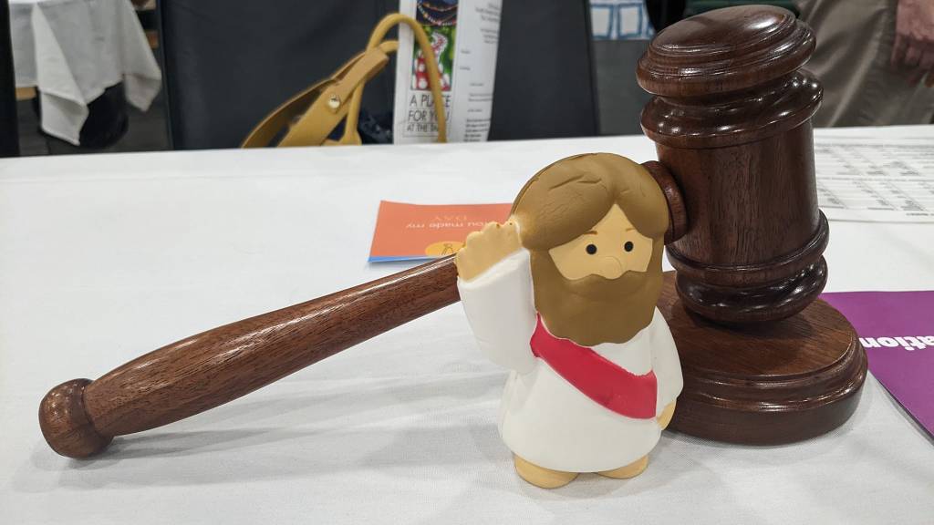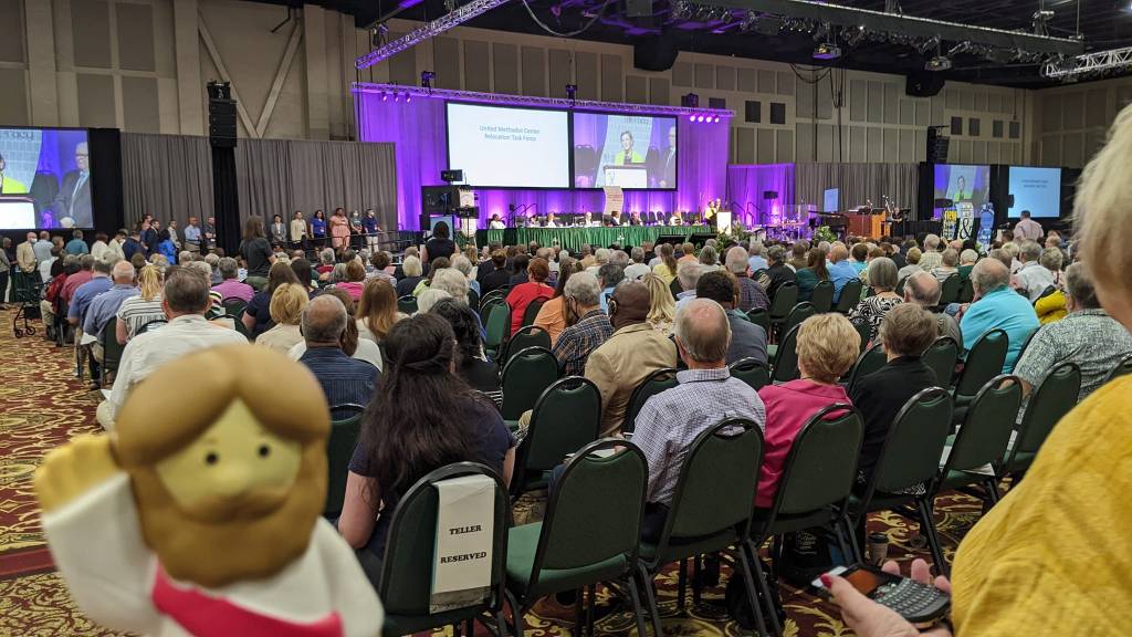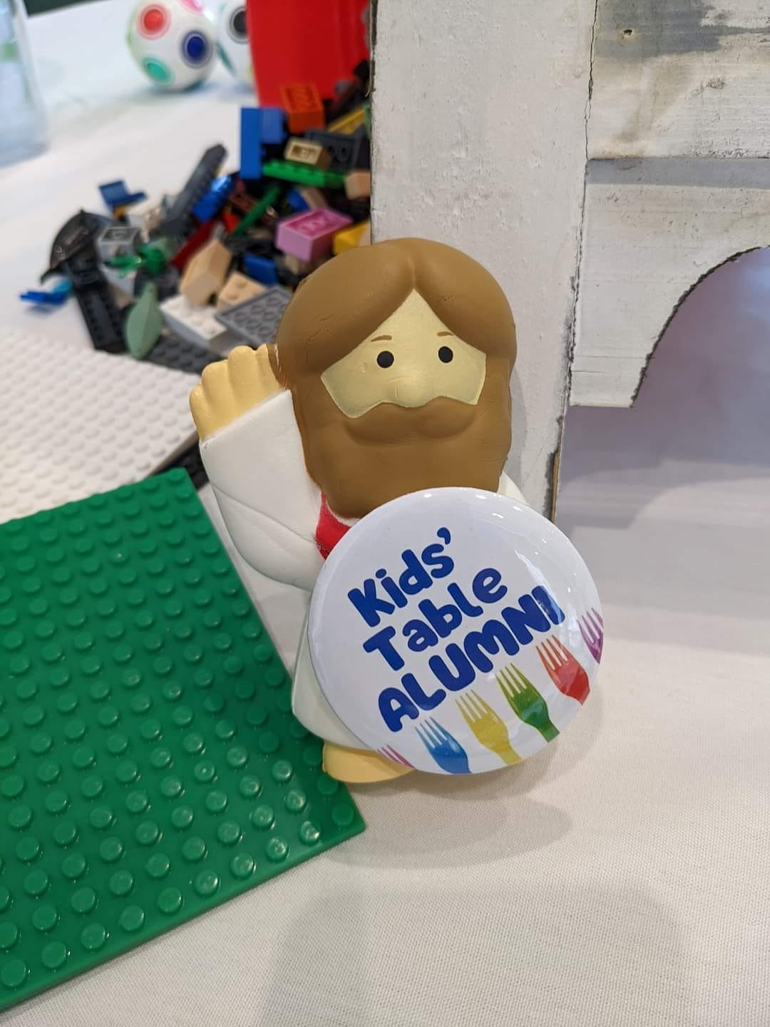 Take-aways – Buttons labeled with “Kid’s Table Alumni” for haven’t we ALL spent time at a kid’s table? May we remember the tables from which we came and return to disciple the littles. Wearing buttons at Annual Conference is a thing. A handful of squishy Jesus-es also made their way around in delightful places.