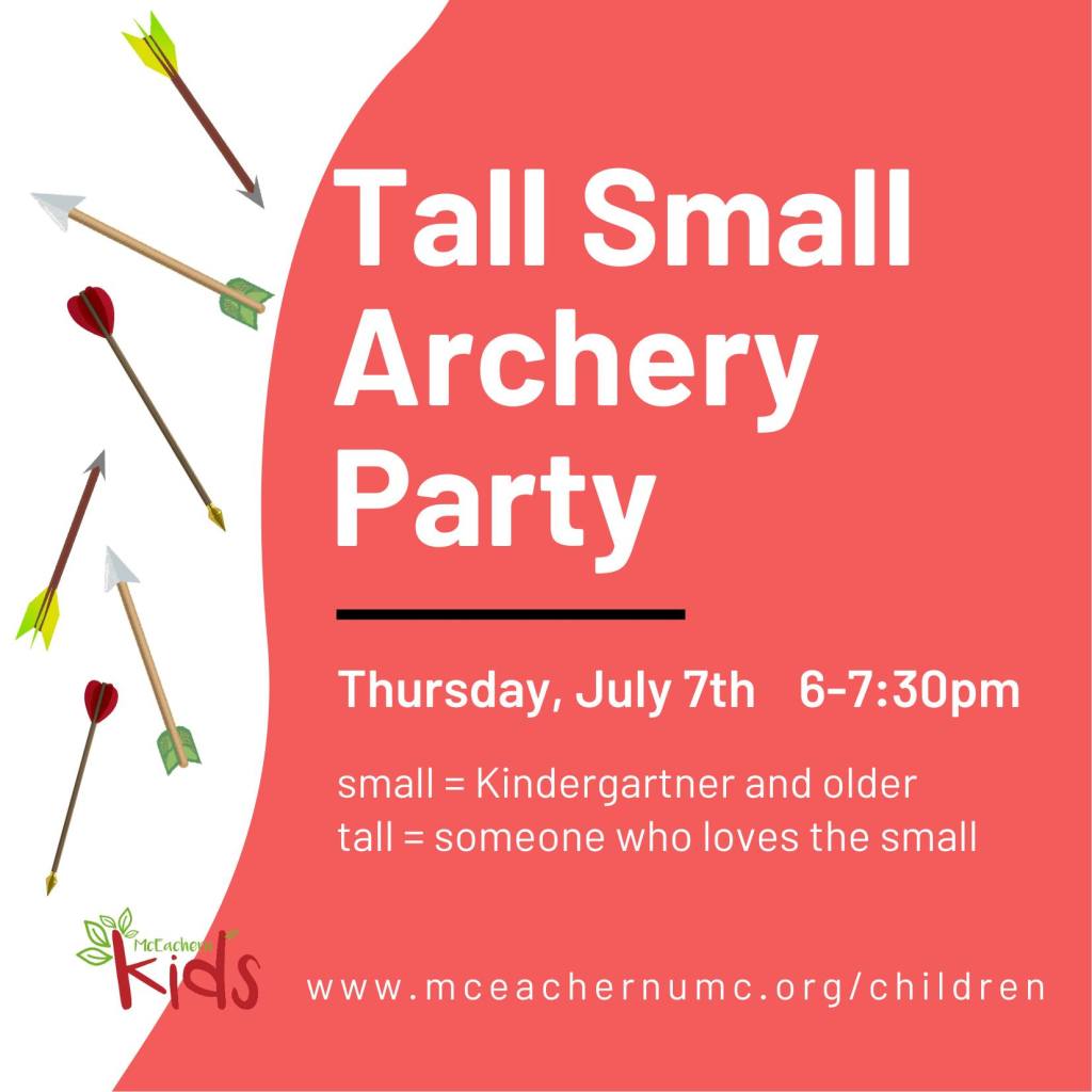 Promotional: Tall/Small Archery Party is for children kindergarten and older (small) with an adult who loves them (tall) on Thursday, July 7, 6-7:30pm in the Gym. Register online. Sponsored by McEachern Kids
