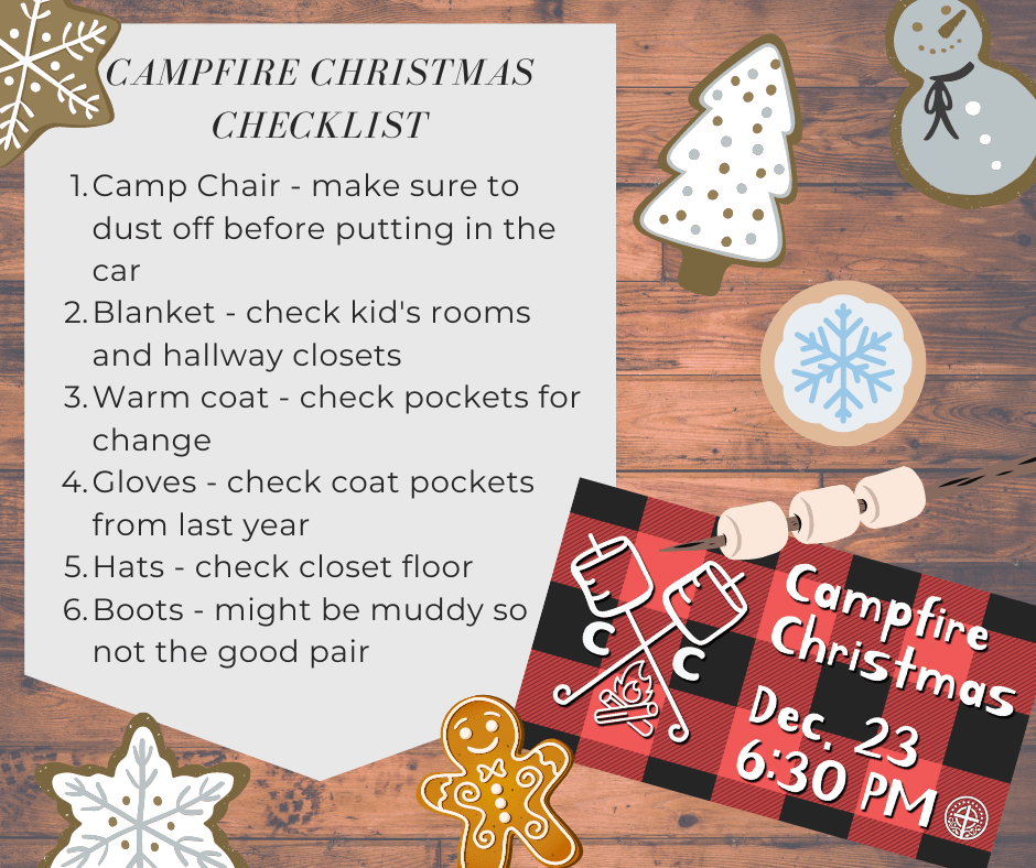 The Campfire Checklist I gleaned last year from a church in Evans, Georgia who modified theirs this year to have the service inside with their firepits under their covered portico. The checklist built energy and let folks know that ‘though the weather outside is frightful, the fire is so delightful…’