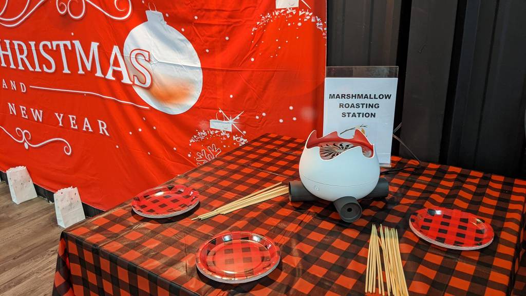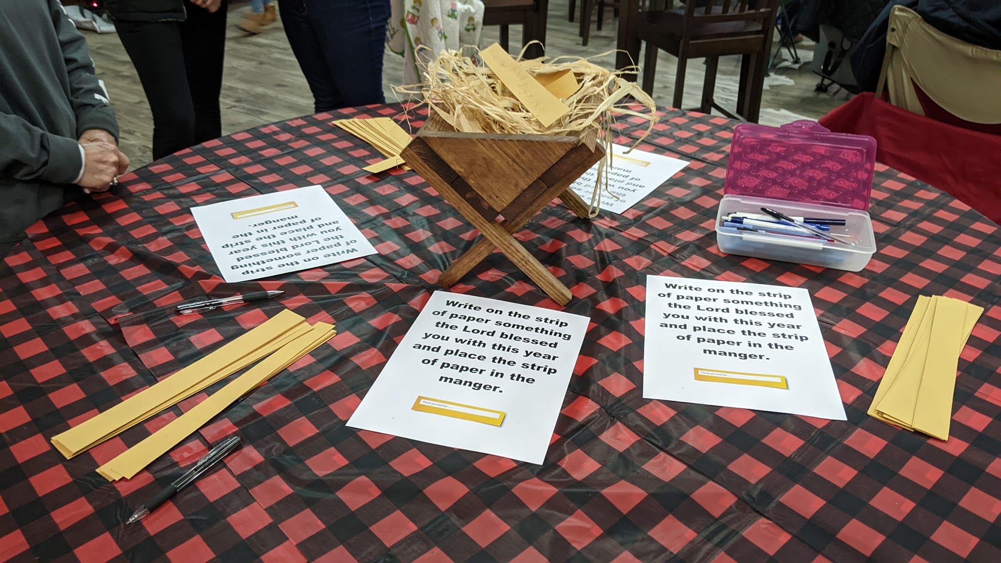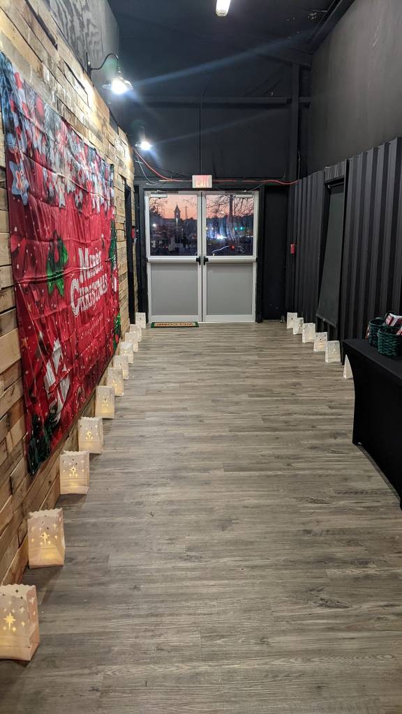 A team of visual artists turned the space into a warm, welcoming, sacred space. Bathrooms were loaded with appropriate welcome supplies, large banners were hung with mega magnets to the metal walls, battery-operated fire pots (from previous VBSs) were arranged in the seating area, luminaries purchased by a generous church for $5 each in honor or memory of a loved one, a hot chocolate bar (we ran out of three gallons of hot chocolate and hot apple cider in less than twenty minutes), and indoor table firepits to roast marshmallows with big blankets along the floors.