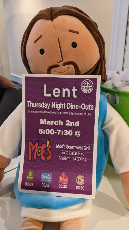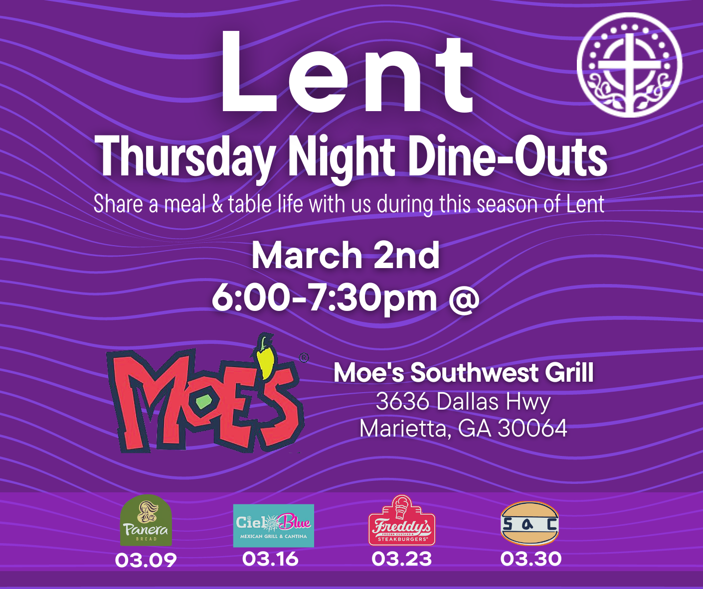 Wanting to bring our Lent celebration outside the church, we decided to offer Lent Dine-outs each Thursday during Lent at a local restaurant. We are inviting everyone and anyone to stop by a local restaurant we’ve already made arrangements with anytime between 6-7:30pm to enjoy a meal with other Christians.