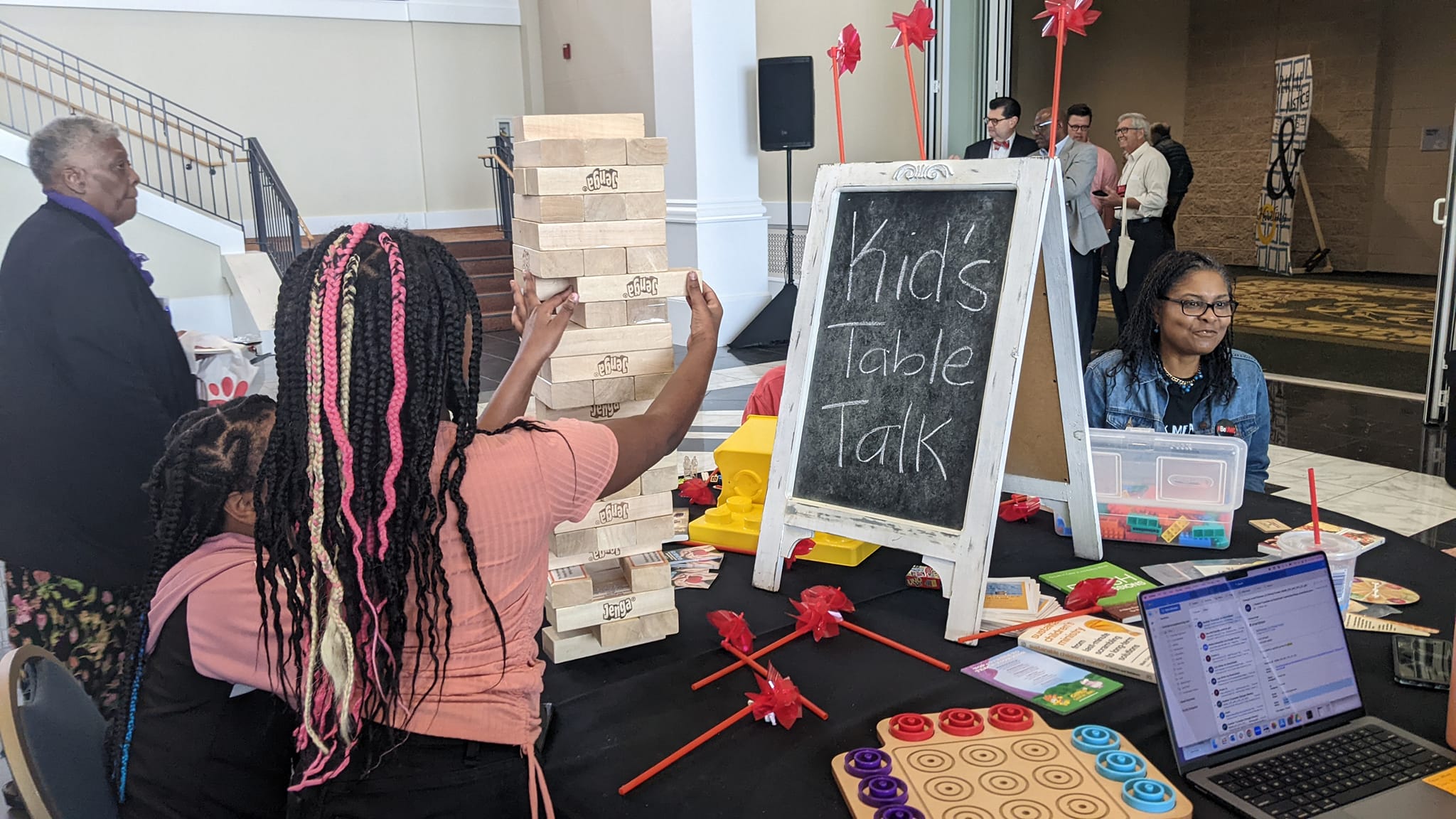 The Kid’s Table has games, books, and people (the church’s greatest resource!) available and accessible. Three champions were wearing t-shirts which read (1) Ask me about Training, (2) Ask me about Safe Sanctuary, (3) Ask me about Family Ministry. Other champions were wearing t-shirts from their children’s ministry and various shared children’s events.