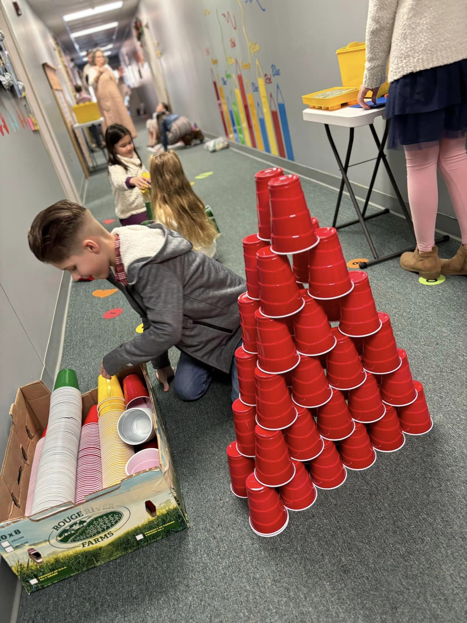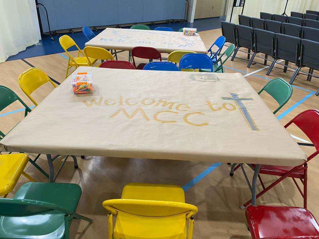 - A prayground space of tables for elementary (and youth) with markers, Alphabots, and connecting straws is a sacred space in the worship center for children to move and remain engaged in worship.