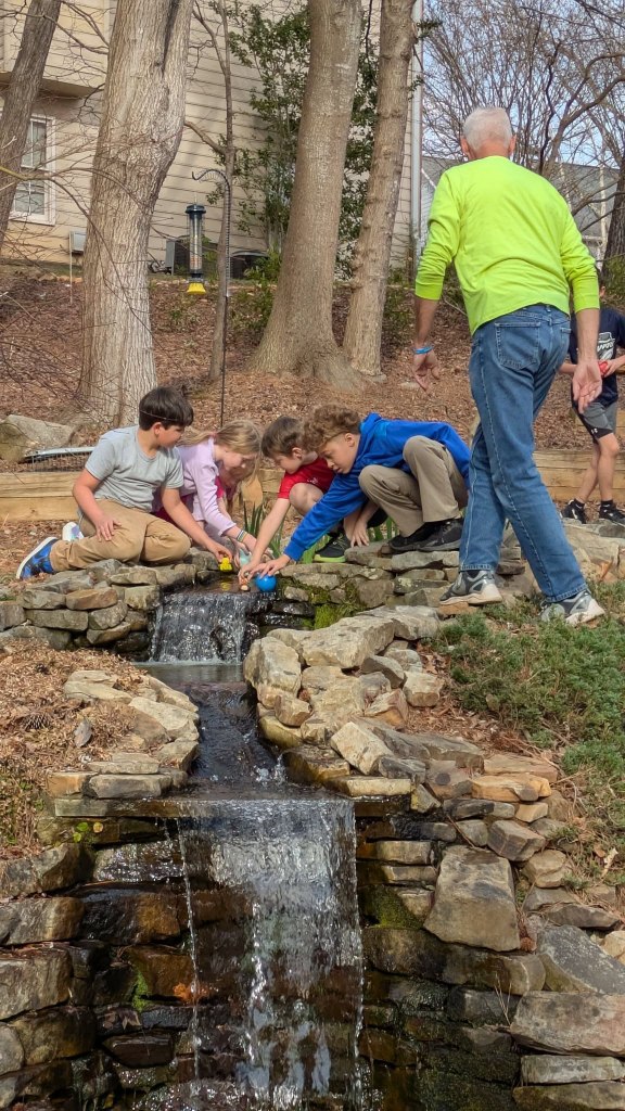 A special stop at the Church Council Chairperson’s home to deliver another plant, say thank you, and—of course—race rubber ducks down their koi pond waterfall! Swings and laughter made this visit extra sweet.