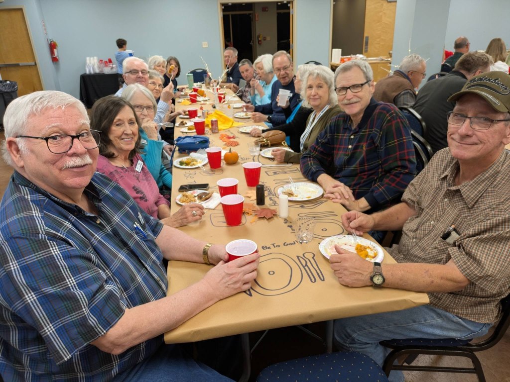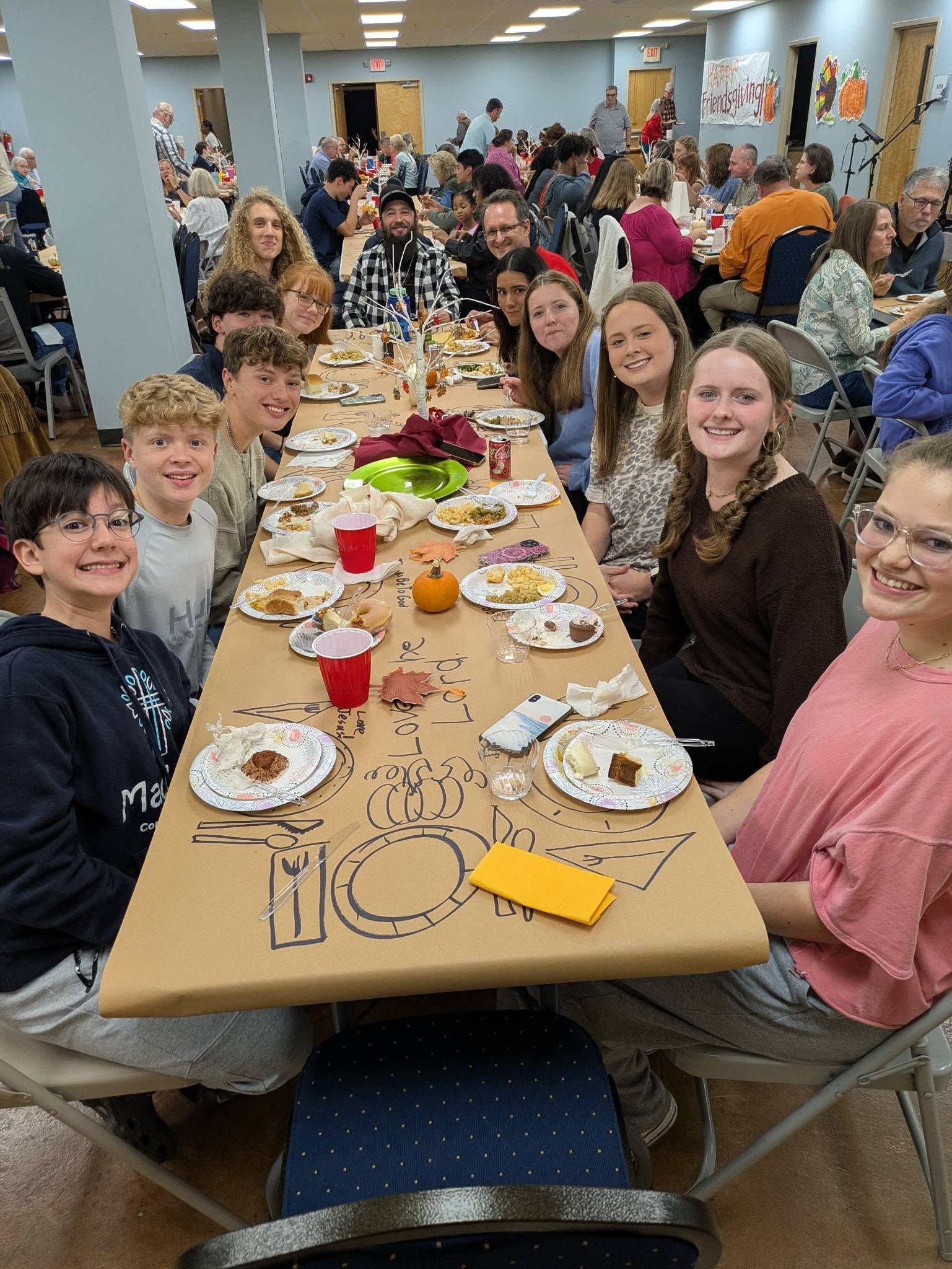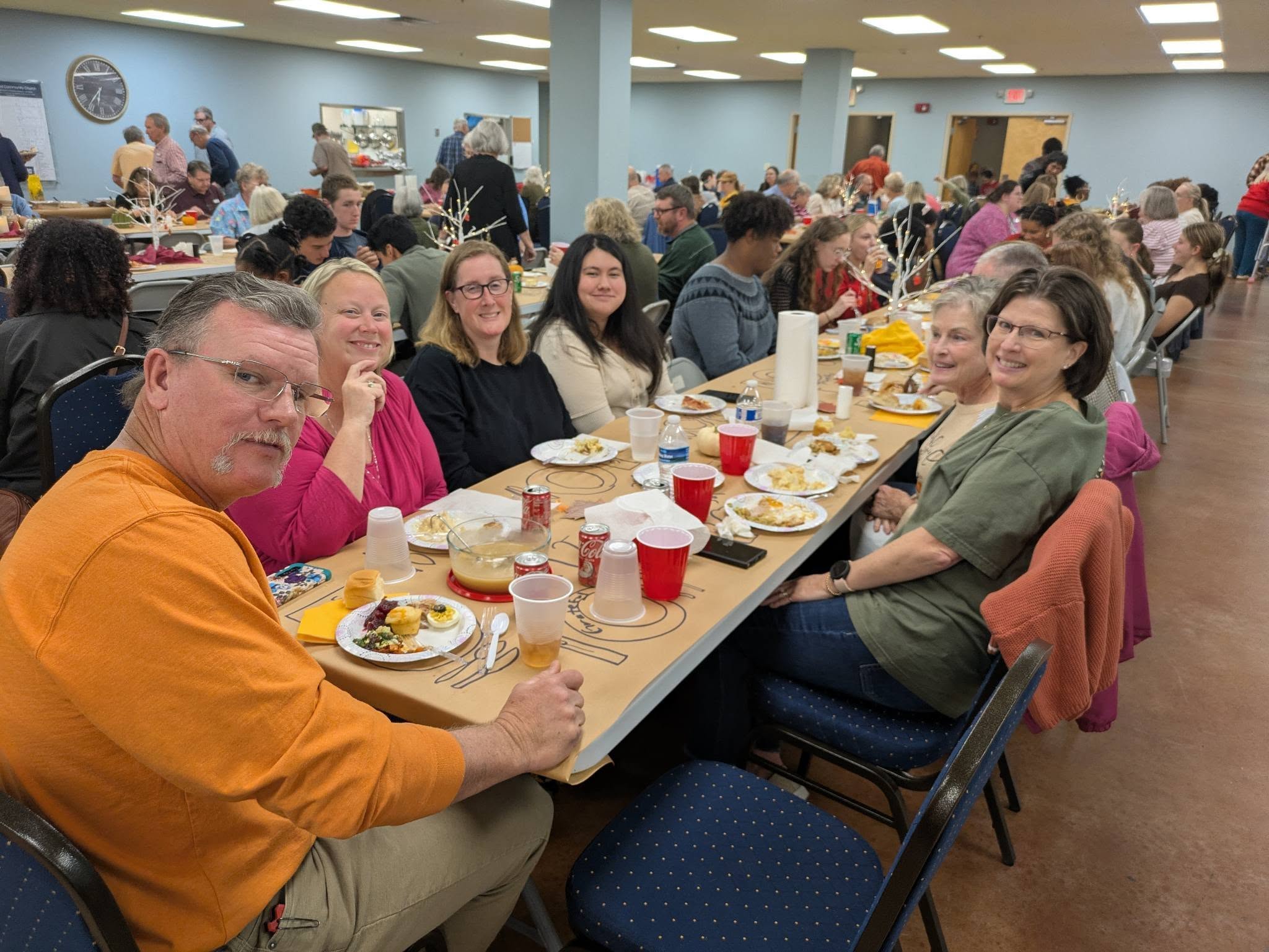 Friendsgiving has become one of our most anticipated annual gatherings. Held the Wednesday before Thanksgiving week from 6–8pm, it all begins with small groups of servants—Ambassadors, staff, the décor team, Confirmation Class, and the kitchen crew—arriving in waves starting at 3pm to stage the space. Everything on campus is cancelled to yield to this CONNECT event. It’s a giant potluck, and we provide the turkey, dressing, and gravy for 200 prepared and delivered by a local chef so the whole event is a generous, free gift to our community.