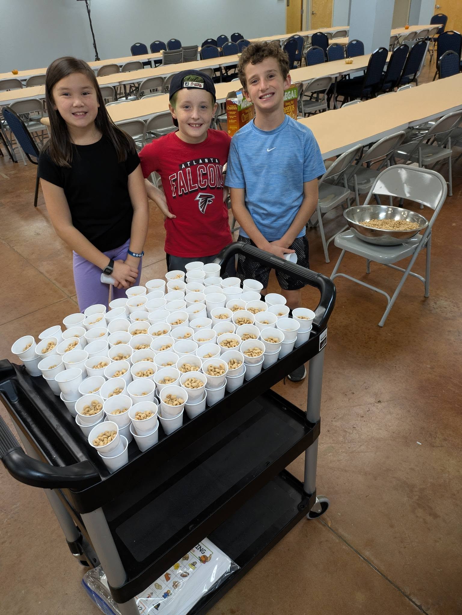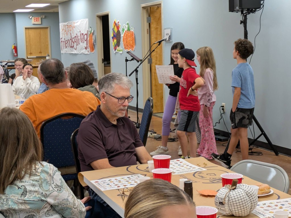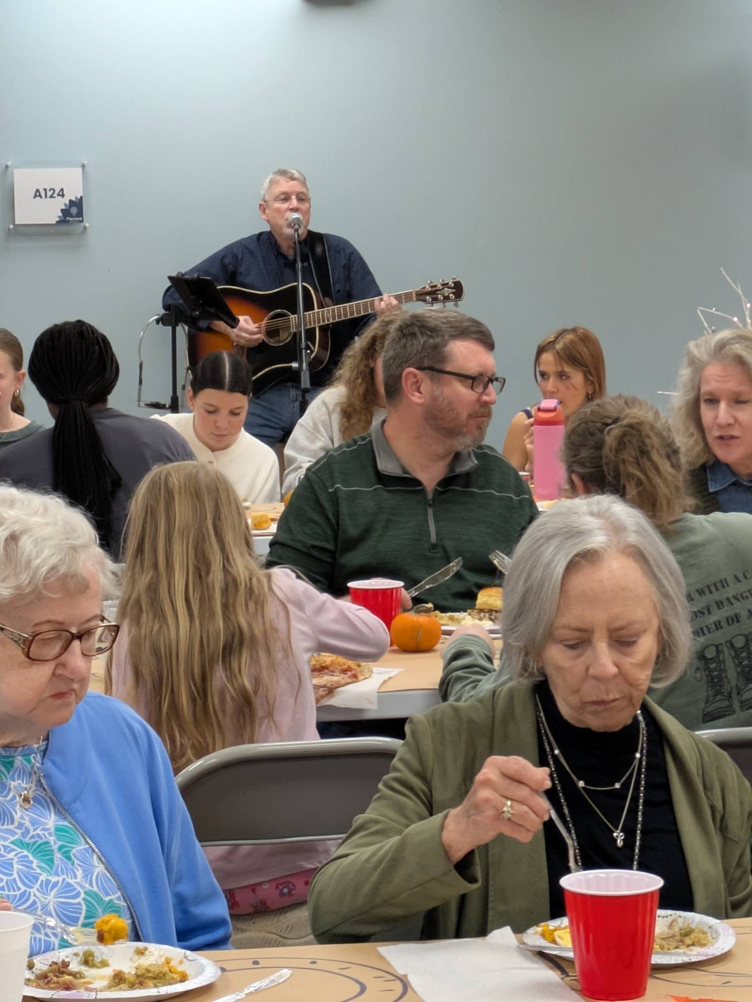 Live acoustic guitar music welcomed guests and filled the room while people visited and waited in line for food. We ate with background, Bluetooth speaker music, then another live song to transition to Thanksgiving Bingo joyfully led by our 4th–5th grade Ambassadors, complete with Kroger gift cards as prizes. The Bingo cards came from Teachers Pay Teachers, and each player received Honey Nut Cheerios as playing pieces—sorted ahead of time by the Ambassadors themselves in 3oz paper cups on a cart.