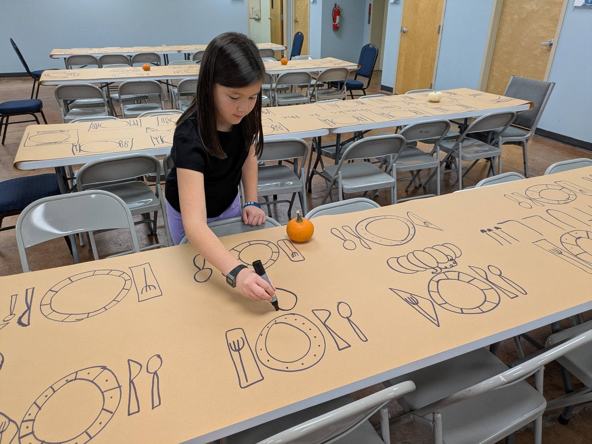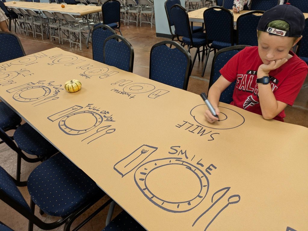 Tables were covered in long sheets of brown paper, inviting all ages of the staging team to write Scripture, doodle place settings, and get creative while a Thanksgiving playlist played in the background. It was slow and peaceful—simple beauty in motion.